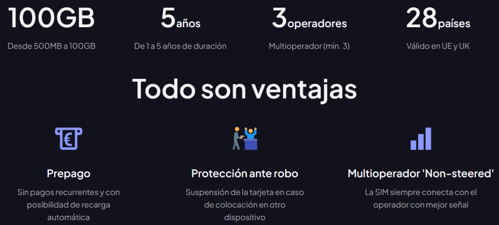 1⃣ Porque al ser 𝐦𝐮𝐥𝐭𝐢𝐨𝐩𝐞𝐫𝐚𝐝𝐨𝐫 te olvidas de problemas de cobertura. Tu tarjeta conectará siempre con el operador que mejor señal tenga, sin ninguna limitación prestablecida.2⃣ Porque funciona 𝐞𝐧 𝐭𝐨𝐝𝐨𝐬 𝐥𝐨𝐬 𝐩𝐚í𝐬𝐞𝐬 𝐝𝐞 𝐥𝐚 𝐔𝐧𝐢ó𝐧 𝐄𝐮𝐫𝐨𝐩𝐞𝐚 𝐲 𝐭𝐚𝐦𝐛𝐢é𝐧 𝐞𝐧 𝐔𝐊 . Puedes desplegar de forma uniforme tu proyecto en múltiples países3⃣ Porque realizas 𝐮𝐧 𝐬ó𝐥𝐨 𝐩𝐚𝐠𝐨 y te aseguras el servicio de conectividad por 𝐮𝐧 𝐦í𝐧𝐢𝐦𝐨 𝐝𝐞 𝟏 𝐚ñ𝐨 𝐲 𝐮𝐧 𝐦á𝐱𝐢𝐦𝐨 𝐝𝐞 𝟓 𝐚ñ𝐨𝐬 . Sin contratos. Sin pagos mensuales. 4⃣ Porque si tu proyecto tiene estacionalidad (control de riegos, sector turístico, etc) 𝐚𝐜𝐮𝐦𝐮𝐥𝐚𝐬 𝐝𝐞 𝐟𝐨𝐫𝐦𝐚 𝐧𝐚𝐭𝐮𝐫𝐚𝐥 𝐥𝐨𝐬 𝐝𝐚𝐭𝐨𝐬 𝐧𝐨 𝐜𝐨𝐧𝐬𝐮𝐦𝐢𝐝𝐨𝐬 en temporada baja.5⃣ Porque si tu proyecto está relacionado con un servicio de mantenimiento 𝐩𝐮𝐞𝐝𝐞𝐬 𝐭𝐫𝐚𝐬𝐩𝐚𝐬𝐚𝐫 𝐝𝐞 𝐟𝐨𝐫𝐦𝐚 𝐬𝐞𝐧𝐜𝐢𝐥𝐥𝐚 𝐞𝐥 𝐜𝐨𝐬𝐭𝐞 𝐝𝐞 𝐥𝐚 𝐜𝐨𝐧𝐞𝐜𝐭𝐢𝐯𝐢𝐝𝐚𝐝 𝐚𝐥 𝐮𝐬𝐮𝐚𝐫𝐢𝐨 𝐟𝐢𝐧𝐚𝐥 o al nuevo contratista6⃣ Porque tendrás un 𝐩𝐨𝐫𝐭𝐚𝐥 𝐝𝐨𝐧𝐝𝐞 𝐬𝐢𝐞𝐦𝐩𝐫𝐞 𝐩𝐨𝐝𝐫á𝐬 𝐯𝐞𝐫 𝐞𝐥 𝐜𝐨𝐧𝐬𝐮𝐦𝐨 𝐚𝐜𝐮𝐦𝐮𝐥𝐚𝐝𝐨 𝐲 𝐥𝐨𝐬 𝐝í𝐚𝐬 𝐲 𝐌𝐁 𝐫𝐞𝐬𝐭𝐚𝐧𝐭𝐞𝐬7⃣ Porque podrás activar una 𝐫𝐞𝐜𝐚𝐫𝐠𝐚 𝐚𝐮𝐭𝐨𝐦á𝐭𝐢𝐜𝐚 para no quedarte nunca sin datos8⃣ Porque recibirás 𝐚𝐥𝐚𝐫𝐦𝐚𝐬 𝐩𝐨𝐫 𝐞𝐦𝐚𝐢𝐥 cuando vayan a expirar tus días o datos del paquete seleccionado9⃣ Porque puedes 𝐛𝐥𝐨𝐪𝐮𝐞𝐚𝐫 𝐭𝐮 𝐭𝐚𝐫𝐣𝐞𝐭𝐚 𝐬𝐢 𝐞𝐬 𝐢𝐧𝐬𝐞𝐫𝐭𝐚𝐝𝐚 𝐞𝐧 𝐨𝐭𝐫𝐨 𝐝𝐢𝐬𝐩𝐨𝐬𝐢𝐭𝐢𝐯𝐨 evitando así el uso indebido Porque si tienes cualquier duda y consulta 𝐚𝐪𝐮í 𝐞𝐬𝐭𝐚𝐦𝐨𝐬 𝐩𝐚𝐫𝐚 𝐚𝐲𝐮𝐝𝐚𝐫𝐭𝐞