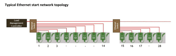 Si nos fijamos en la alternativa tradicional, es decir, mediante switches Ethernet podemos optar por una arquitectura en estrella con switches no gestionables pero nos obliga a tirar un cable UTP para cada cargador al que queremos conectar. Para parkings grandes, las distancias mayores de 100m pueden obligarnos a tener que instalar tendidos de fibra o switches intermedios a modo de repetidor pero que introducen un punto crítico de fallo porque en caso de caída afectan a todos los nodos detrás de él.