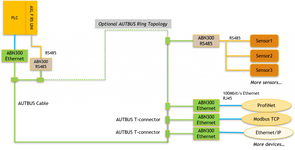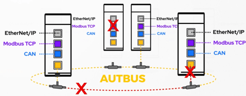 AUTBUS es un bus de comunicaciones para entornos industriales que permite velocidades de hasta 100Mb/s sobre un par de hilos y admite topologías en bus o anillo de hasta 254 nodos multi-drop con una distancia máxima de 500m