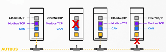 AUTBUS es un bus de comunicaciones para entornos industriales que permite velocidades de hasta 100Mb/s sobre un par de hilos y admite topologías en bus o anillo de hasta 254 nodos multi-drop con una distancia máxima de 500m