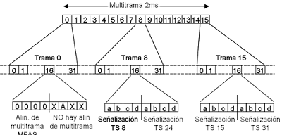 Llegados a este punto nos vuelve a surgir otro dilema.¿Cómo podemos ubicar la señalización correspondiente a 30 canales en un único canal (TS16)?Para ello tenemos que crear una nueva estructura, la multitrama, que comprende 16 tramas consecutivas y que se repite cada 2 ms como vemos en la figura anterior. Dividimos cada TS16 en dos bloques de 4 bits (4+4). El TS16 de la trama 0 incluye la secuencia 0000 en el primer bloque y constituye el alineamiento de multitrama. El TS16 de la trama 1 incluye la señalización de los canales 1 y 9 (1+8). El TS16 de la trama 2 incluye la señalización de los canales 2 y 10 (2+8) y así sucesivamente hasta la trama 15 y última cuyo TS16 incluye la señalización de los canales 7 y 15 (7+8).
