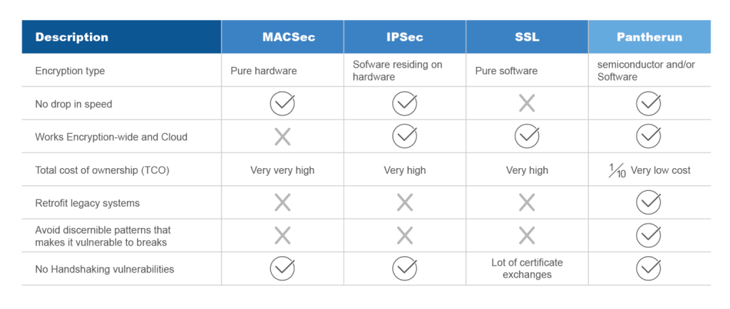 En la siguiente tabla comparamos la tecnología Pantherum frente a otras como MACSec, IPSec o SSL.