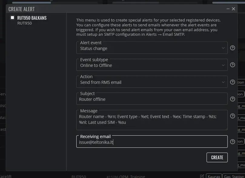 La alarma Last Gasp informa instantáneamente cada vez que alguno de los dispositivos de la flota se desconecta de RMS. Permite reaccionar rápidamente y reducir al mínimo el tiempo de indisponibilidad. Además, el uso de mensajes personalizados permite recuperar información sobre los parámetros del dispositivo justo antes de que se pierda la comunicación.