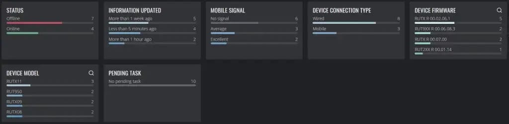Hemos agregado numerosos gráficos para visualizar información general sobre el estado de la flota, las actualizaciones de firmware, la intensidad de la señal móvil y otros parámetros de monitororización críticos que pueden ser esenciales para controlar las soluciones de IoT, planificar el mantenimiento o diagnosticar problemas.