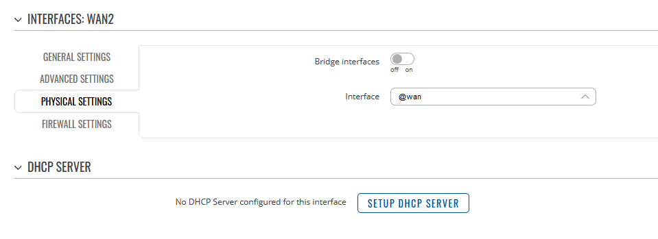 Para cada una de las interfaces en el apartado Physical settings cambiaremos el tipo de Interfaz al valor @wan . Este valor se tiene que escribir manualmente ya que dicha opción no está disponible en el desplegable del interfaz web.