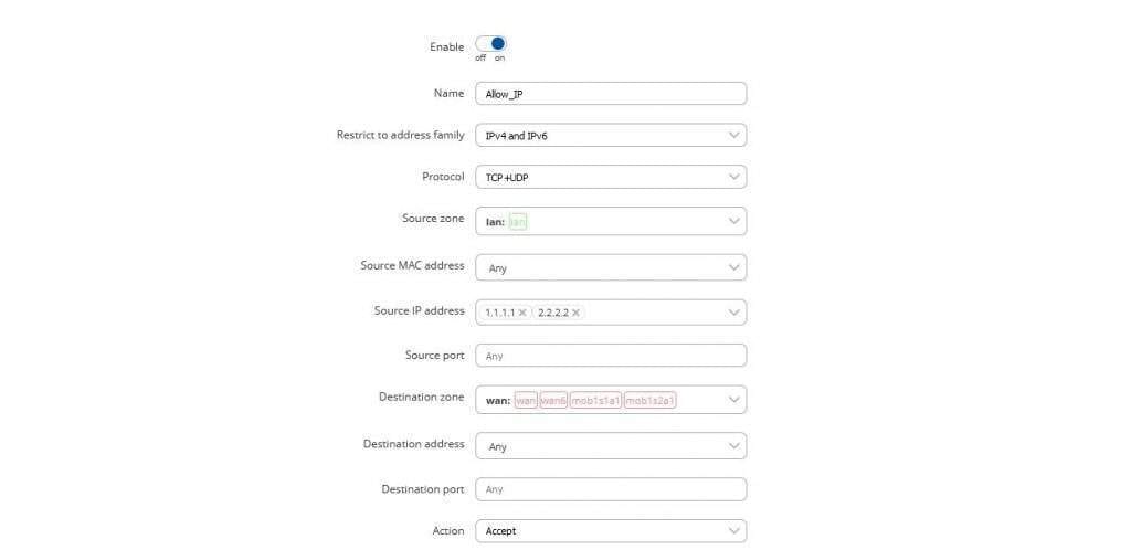 Para realizar esta configuración, debemos crear dos reglas: una primera que bloquee todo el tráfico de salida a Internet (primer ejemplo) y a continuación una segunda regla que permita sólo el acceso a determinadas direcciones IP en la WAN (1.1.1.1 y 2.2.2.2 en la siguiente captura).