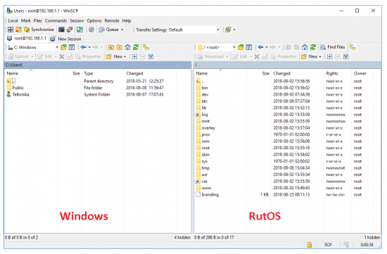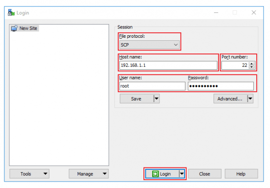 A continuación tenemos que descargar la clave generada en el propio router para luego cargarla tanto en este router como en el router de la sede remota. Para ello usaremos el programa WinSCP para Windows y crearemos una nueva sesión del tipo SCP contra la IP LAN del router, puerto 22 y usando el usuario y el password de acceso al router.