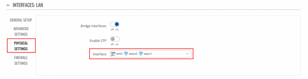 A continuación edita el interfaz LAN y ves a Physical settings donde añadiremos el interfaz desde el menú desplegable.
