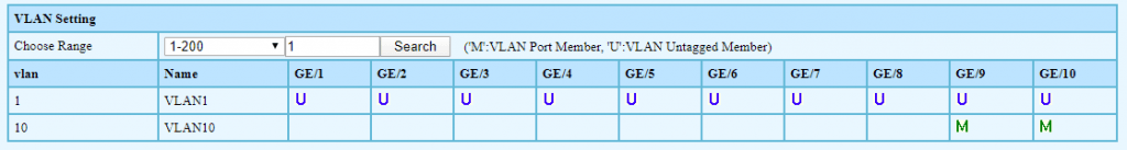 Los paquetes de control del anillo en ERPS deben encapsularse en una VLAN preferiblemente dedicada únicamente a este tráfico. Para ello tendremos que crear una VLAN (VLAN10 en nuestro ejemplo) para transportar el protocolo ERPS y luego configurar los puertos del switch pertenecientes al anillo en modo trunk añadiendo la VLAN10 a dicho trunk. en la captura siguiente vemos cómo quedaría la configuración de las VLANs asumiento que el anillo se forma con los puertos GE/9 y GE/10 de fibra del switch (U – untagged; M – tagged)