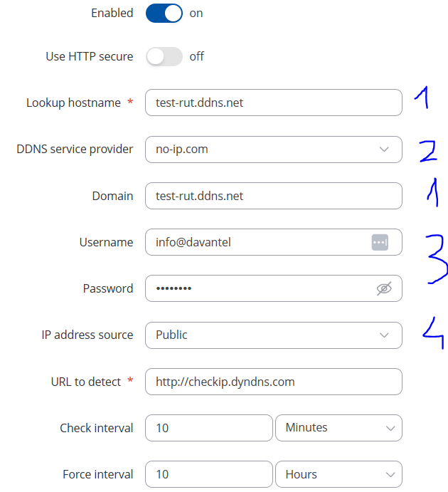 Lookup hostname y domain: introduciremos el nombre de dominio creado en el proveedor del servicio DDNS