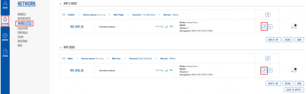 A continuación vaya a la opción Network -> Wireless y pinche en el botón de edición de la derecha para configurar dicha interfaz.