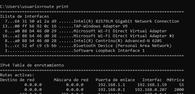 Al arrancar el cliente VPN en modo TAP, se crea automáticamente en nuestro ordenador una ruta estática por defecto que apunta al servidor VPN. Esto lo podemos comprobar abriendo una ventana CMD y escribiendo el comando route print.