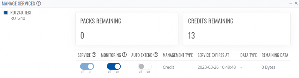 También podemos acceder al uso de créditos por dispositivo seleccionando el dispositivo en la página de Management – Devices y una vez seleccionado el dispositivo seleccionamos el menú Device – Manage Services
