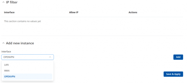 Como en el caso del equipo Maestro tendremos que añadir después el interfaz OPENVPN en la sección IP filter y finalmente pincharemos sobre el botón Save & Apply para guardar los cambios realizados.