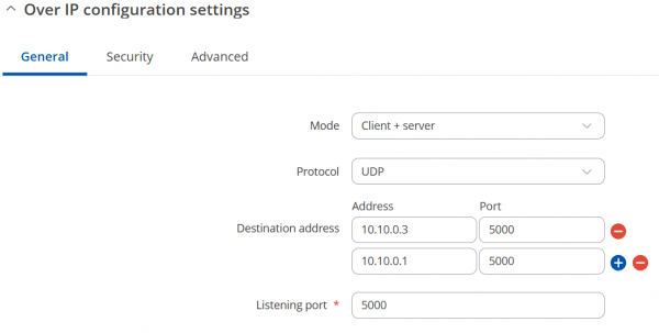En el párrafo siguiente Configuration settings configuraremos el modo de operación del puerto serie. En el parámetro Mode configuraremos ‘Client + server’ puesto que el maestro debe por un lado funcionar como cliente UDP para enviar los paquetes a múltiples esclavos pero por otro lado también debe funcionar como server para recibir las conexiones entrantes con los paquetes enviados por los diferentes clientes. En protocolo configuraremos UDP y en Destination address iremos añadiendo las direcciones IP de los equipos clientes. En nuestro caso como la comunicación entre maestro y esclavos se hace a través de una VPN añadiremos las direcciones IP de los extremos de los túneles tal y como se muestra en la figura anterior. Finalmente en Listening port escribiremos el puerto donde atiende el servidor (server) las conexiones entrantes de los clientes UDP extremos.