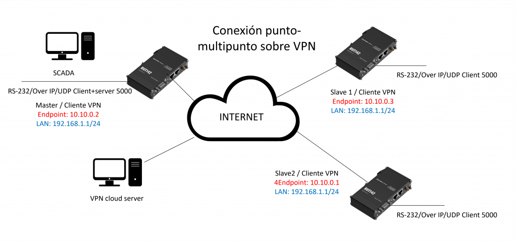 Este artículo se centra en la configuración del puerto serie de los routers RUT142 y por tanto asumimos que los equipos ya han sido configurados como clientes VPN del servidor VPN en cloud. Si unos de los equipos dispusiera de una IP pública y accesible (con posibilidad de abrir puertos entrantes) podría también configurarse como servidor VPN en la topología.
