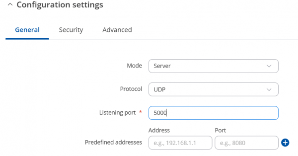 En el párrafo siguiente Configuration settings configuraremos el modo de operación del puerto serie. En el parámetro Mode configuraremos ‘Server’ ya que este equipo debe aceptar las conexiones entrantes del equipo Maestro configurado como ‘Client’. El Listening port debe coincidir con el puerto configurado en las Destination Address en el equipo Master. En nuestro ejemplo hemos usado el mismo puerto UDP 5000 para ambos sentidos (Master a slaves y Salves a Master) pero podríamos haber configurado puertos diferentes.
