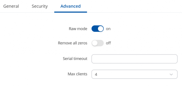 En la pestana Advanced podemos configurar algunos otros parámetros como el Raw mode que permite transmitir de format totalmente transparente todos los caracteres recibidos por el puerto serie sin importar su formato o codificación o fijar un timeout en el que enviar el paquete por IP ante la ausencia de tráfico por el puerto serie. Finalmente el parámetro Max clients no permite limitar el número de clientes remotos que pueden conectarse a nosotros (sólo aplica para modo server).
