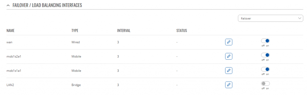 A continuación seleccionaremos el menú Network – Failover y añadiremos los interfaces que queramos incluir en el mecanismo de failover moviendo el cursor a la posición de ON y verificando antes que en la parte superior tenemos seleccionada la opción Failover (si desplegamos veremos que podemos usar también este menú para configurar el Load Balancing). Si tenemos dos SIM insertadas en el router deberemos añadir ambos interfaces móviles al failover.