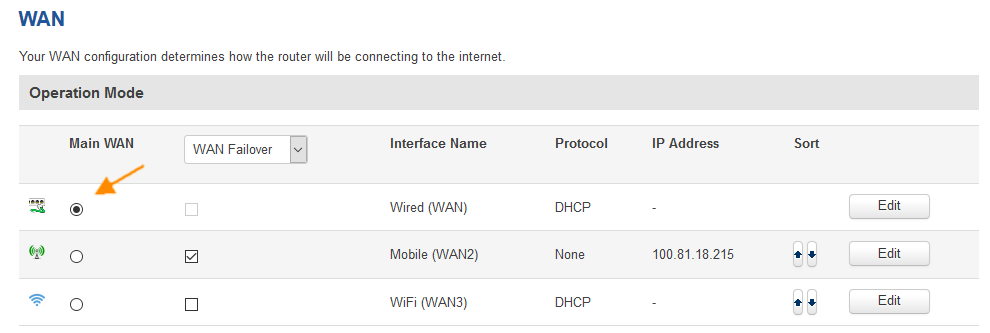 En estos modelos iremos al menú Network – WAN y seleccionaremos el enlace principal (Main WAN) y el enlace secundario (WAN failover). Por defecto de fábrica ya vienen configurados como se muestra en la captura siguiente, es decir, como backup móvil de la conexión WNA RJ45.