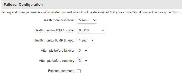 Para detectar la disponibilidad del enlace se usa el mecanismo de ICMP Ping a una dirección pública y accesible (8.8.8.8 en nuestro ejemplo). Podemos configurar el retardo en la respuesta, el número de reintentos y el tiempo entre comprobaciones. Finalmente marcaremos Execute command para activar la comprobación.