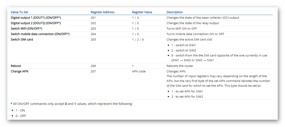 De forma análoga podemos controlar algunos aspectos básicos del funcionamiento del router a través del protocolo Modbus mediante la escritura de determinados registros. En estos registros, que mostramos en la tabla siguiente, el router consulta de forma periódica la información almacenada a fin de llevar a cabo ciertas acciones como por ejemplo la activación o desactivación de la interfaz WiFi o móvil o incluso el reseteado del router.