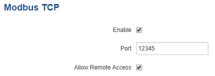 Basta ir a la pestaña correspondiente y marcar la opción Enable, configurar el puerto TCP que usaremos (podemos seleccionar uno diferente al estándar si tenemos ya algún dispositvo Modbus detrás del router y ya hemos creado nuestra regla de port forwarding) y habilitar el acceso remoto si las peticiones Modbus nos van a llegar a través del interfaz WAN.