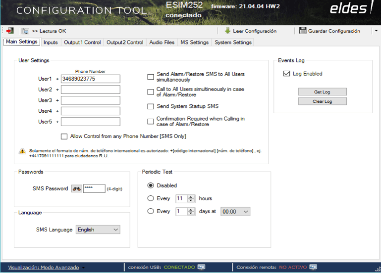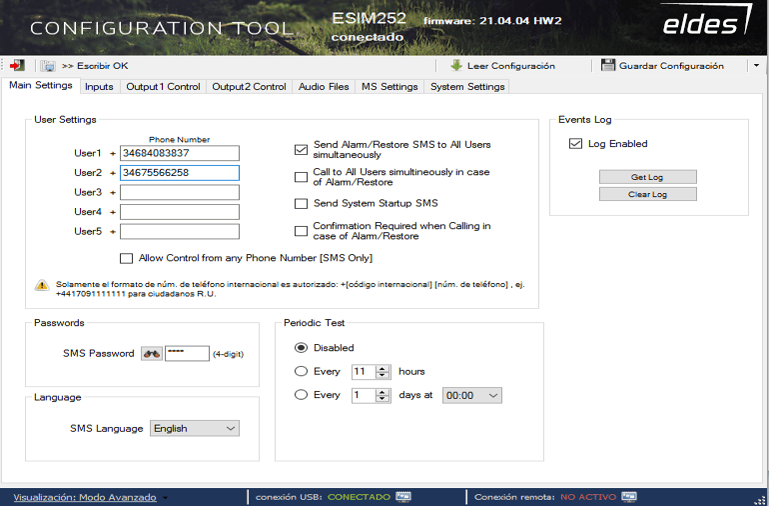 Configuramos User1 con el número de teléfono del ESIM252 conectado al depósito.