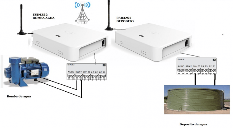 Cuando el depósito baja de un cierto nivel la sonda activa una entrada del ESIM252 y éste envía un SMS al ESIM252 de la bomba para que la arranque y llene de nuevo el depósito