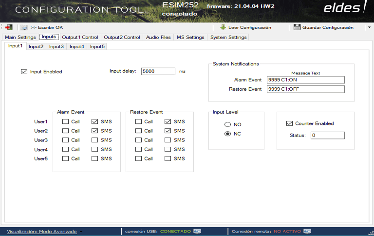 Marcaremos la casilla SMS en Alarm Event y Restore Event para User1 (envío al equipo remoto) y User2