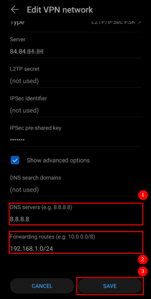 Rutas de reenvío: añadiremos la LAN del router servidor L2TP, es decir, 192.168.1.0/24 si no la hemos cambiado. Este es l rango de nuestra LAN remota.