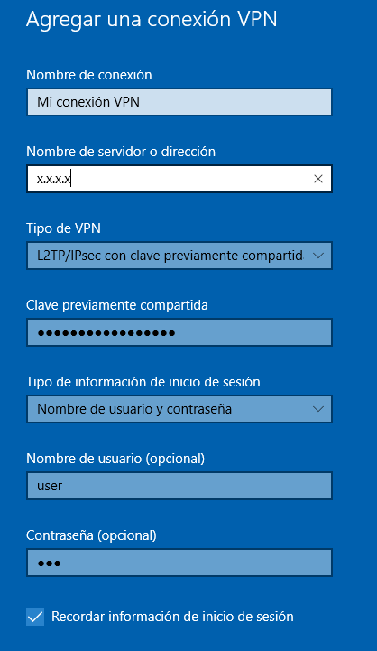 A continuación configuraremos la conexión VPN de la siguiente forma