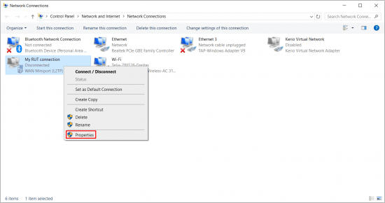 Para ello iremos a las conexiones de red de nuestro ordenador, seleccionaremos la conexión VPN que hemos creado y con el botón derecho del ratón pincharemos sobre la opción Propiedades.
