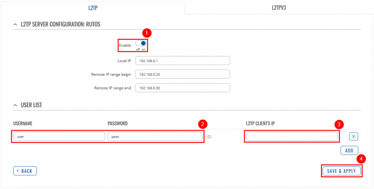 Iremos al menú Services – VPN – L2TP y realizaremos los siguientes pasos: