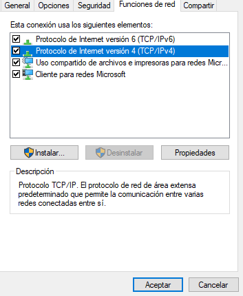 A continuación seleccionaremos la pestaña Funciones de red y haremos doble click sobre la línea Protocolo de Internet versión 4 (TCP/IPv4).