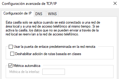 En la ventana siguiente comprobaremos que tenemos habilitado el servicio DHCP tanto para la dirección IP como para los servidores DNS y pincharemos sobre el botón Opciones Avanzadas. En la siguiente ventana desmarcaremos la opción Usar la puerta de enlace predeterminada en la red remota