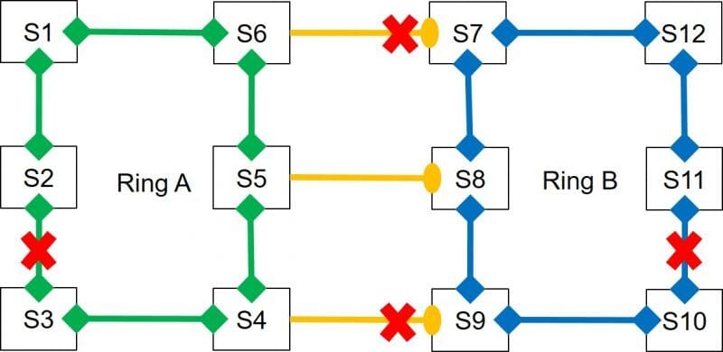 Este protocolo es una extensión de Kyland que permite la conexión de forma redundante de dos anillos. En efecto, tal y como se muestra en la siguiente figura, conectamos tres nodos del anillo A (S4, S5 y S6) a otros tres nodos del anillo B (S7, S8 y S9) respectivamente. De cara a evitar bucles, sólo una de las conexiones está activa (forwarding) mientras que las otras dos están en stand-by (blocking).