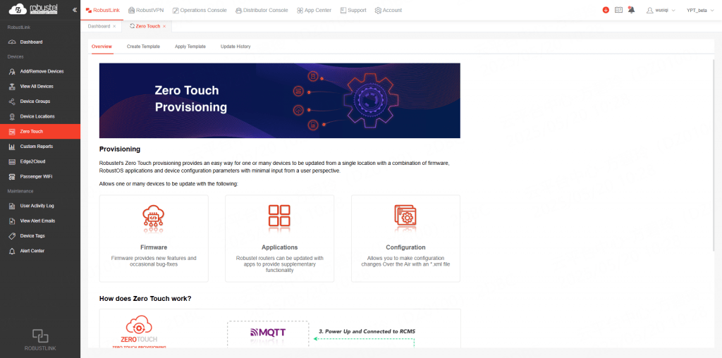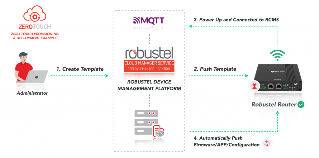 El Zero Touch en el Robustel Cloud Manager Service (RCMS) permite que sus dispositivos se configuren automáticamente, sin necesidad de visitar sitios o realizar configuraciones manuales. Sus capacidades clave incluyen: