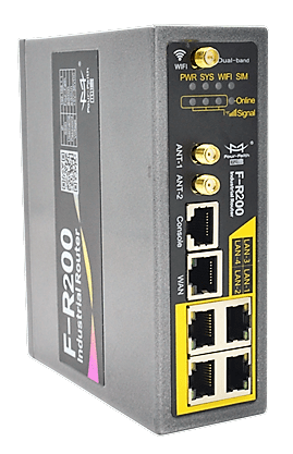 El F-R200 es un router 4G/LTE CAT4 con velocidades de hasta 150Mbps que dispone de 4 puertos Ethernet Gigabit, un puerto RS232, entradas y salidas digitales y un Access Point WiFi dual band 2.4GHz y 5GHz. Incorpora cliente y servidor VPN (PPTP, L2TP, IPSec y GRE). El router soporta temperaturas de funcionamiento de -25ºC a +65ºC. El puerto serie pude funcionar como UDP o cliente/servidor TCP o incluso como gateway Modbus TCP a Modbus RTU/ASCII.