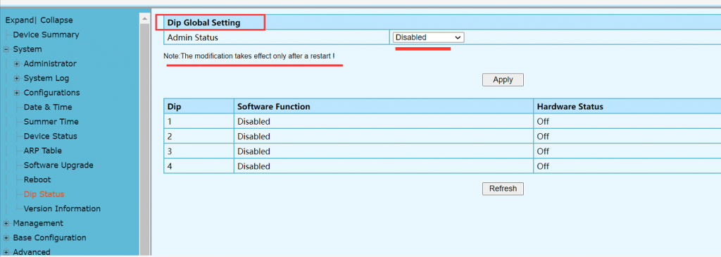 Estos microinterruptores permiten la configuración del equipo de una forma Plug & Play sin necesidad de un PC para la parametrización via web o comandos en aplicaciones sencillas (estrella, bus o anillo RSTP).