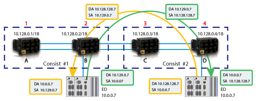 En el ejemplo anterior vemos como los nodos del vagón #2 reconfiguran su direccionamiento IP para no coincidir con los del vagón #1.