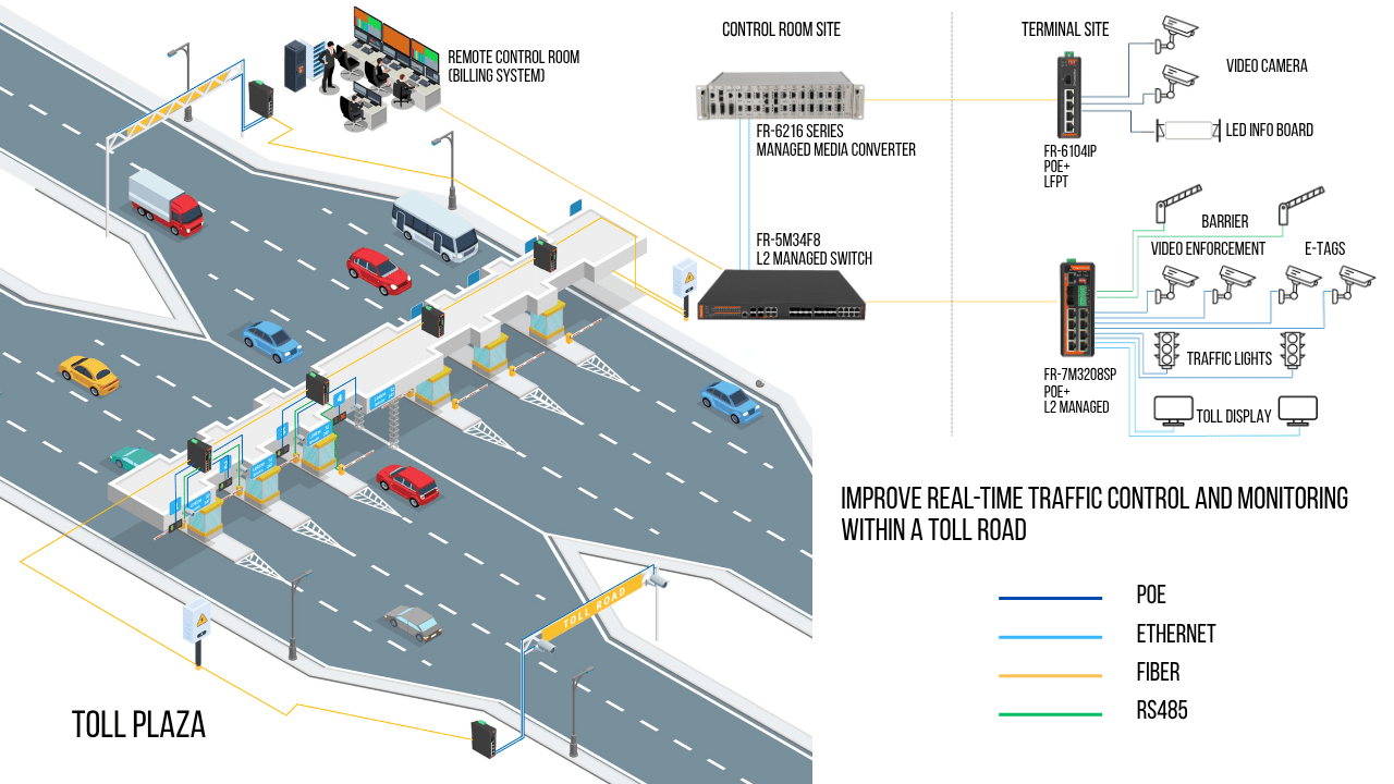 La solución de Telepeaje Electrónico (ETC) de Fiberroad ofrece un sistema fiable, de alto rendimiento y escalable, diseñado para optimizar las operaciones de peaje, mejorar la eficiencia y reducir la congestión vehicular. Al integrar switches gestionados de capa 2 avanzados, conversores de medios de fibra y dispositivos industriales PoE, Fiberroad garantiza una agregación de datos sin interrupciones, comunicaciones en tiempo real y una robusta redundancia de red en las plazas de peaje y los centros de control.