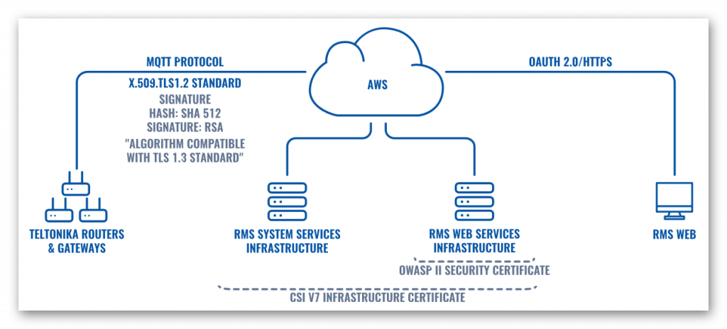 Los routers y gateways de Teltonika se comunican con RMS a través del protocolo MQTT (Message Queuing Telemetry Transport) que ha sido escogido por sus mecanismos de seguridad. MQTT está securizado con el protocolo TLS y protegido de acuerdo al algoritmo de firma estándar según X.509 TLS 1.2. Todas las comunicaciones entre cualquier equipo y RMS se firman y encriptan con una firma RSA. De forma combinada, este método cumple con los requerimientos del protocolo TLS 1.3 lo que garantizad una privacidad sin rival en el mercado y un rendimiento mejorado respecto la versiones anteriores de TLS y tráfico HTTP no securizado.