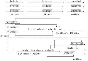 En la figura siguiente vemos un ejemplo donde multiplexamos 3 flujos de 64Kbit/s de velocidad cada uno resultando en un flujo combinado teórico de 3 x 64 = 192 Kbit/s