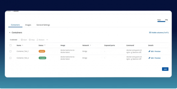 Con RutOS 7.16, la gestión de aplicaciones en contenedores se vuelve mucho más intuitiva en los routers RUTC50 5G, gracias a la página WebUI dedicada de Docker. Esta nueva interfaz permite a los usuarios configurar y controlar los contenedores Docker directamente a través de la interfaz web de los routers 5G, eliminando la necesidad de acceder a la línea de comandos o a herramientas externas.