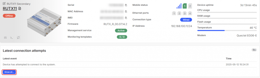 Luego, en el lado de RMS, realizar la verificación latest connection attempts logs en la página de Device details después de que el dispositivo intente la reconexión: