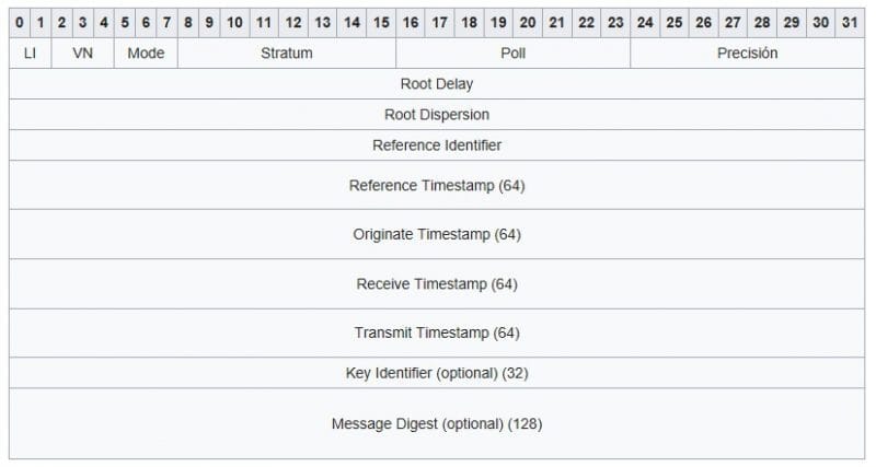 En la siguiente figura se muestra el formato y contenido del paquete NTP reply en versión 4 que entrega un servidor NTP a petición de cualquier cliente. Los paquetes NTP se encapsulan en UDP y típicamente usan el puerto 123.