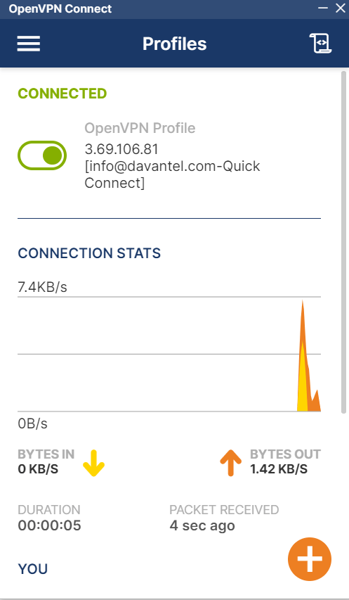 A continuación iremos al directorio donde descargamos el fichero ovpn y pincharemos sobre él. Si previamente hemos instalado la aplicación VPN Connect se nos abrirá y podremos importar la configuración del fichero conectando nuestro PC directamente a la VPN. Si todo funciona correctamente veremos que la conexión se ha establecido y está cursando tráfico.
