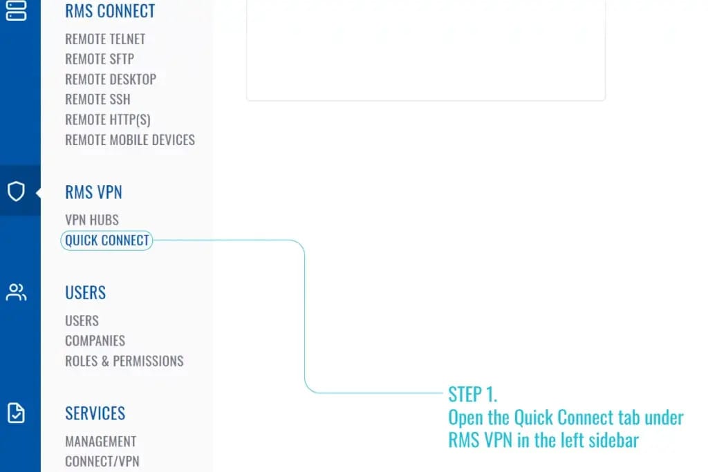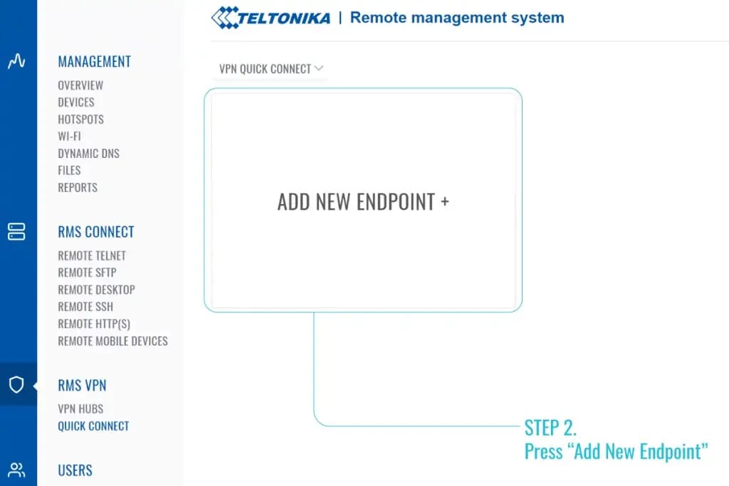 Primero crearemos un nuevo túnel QUICK CONNECT desde el submenú en RMS VPN.