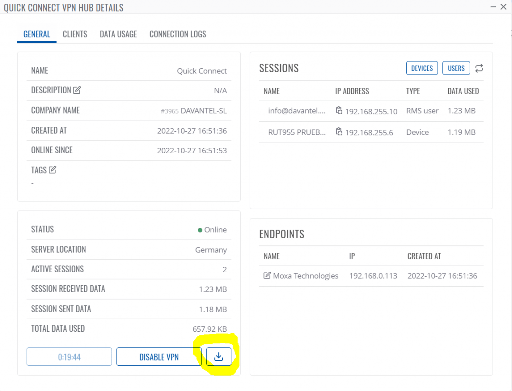 En el cuadro ENDPOINTS veremos la información de nuestro endpoint incluyendo su dirección IP. En esta pantalla también podemos descargar el fichero ovpn para nuestro PC pinchando en el icono marcado en amarillo si no lo hemos hecho anteriormente.